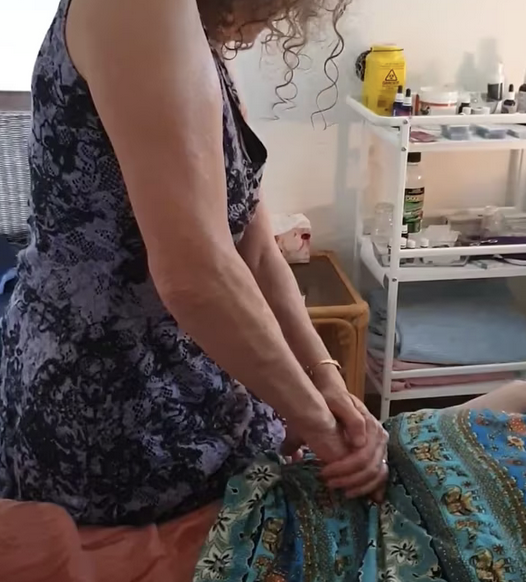 - How to do it – gently take their lower legs back, your right lower arm as the ‘bar’ – and at the same time press towards the end of the table, with your left hand on the sacrum – so that also gets a good stretch.