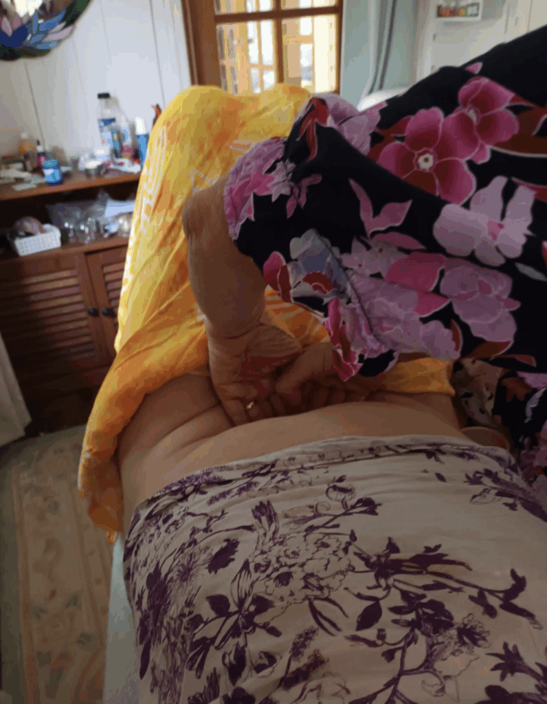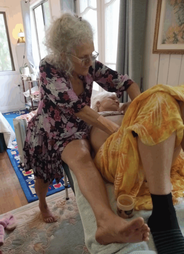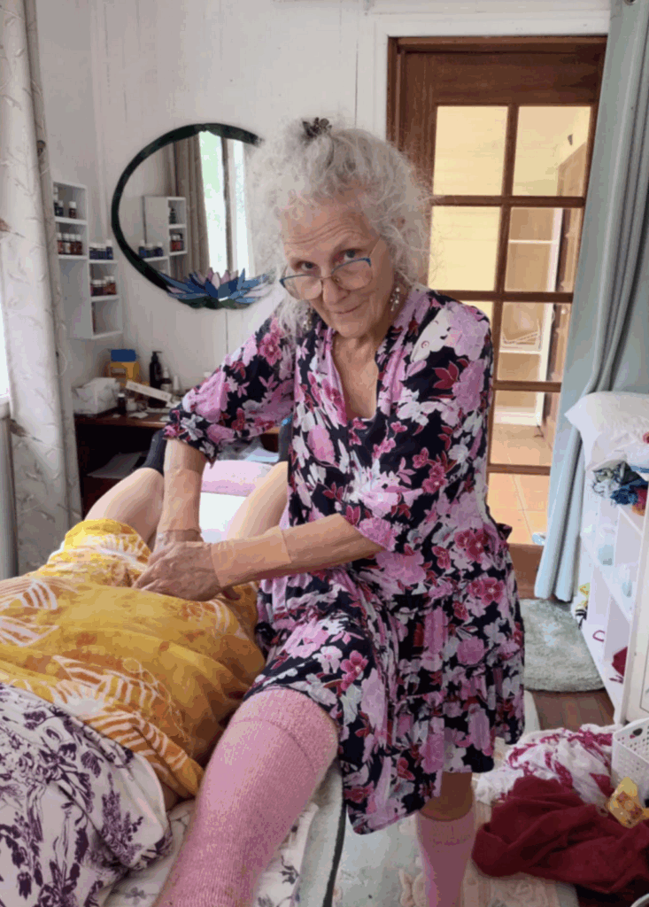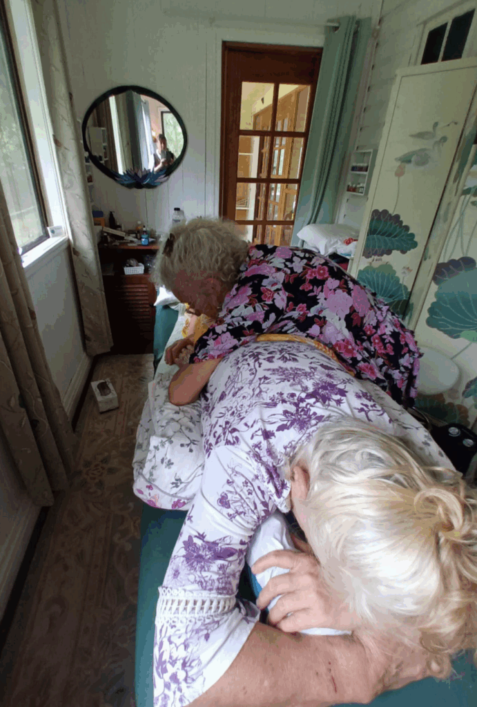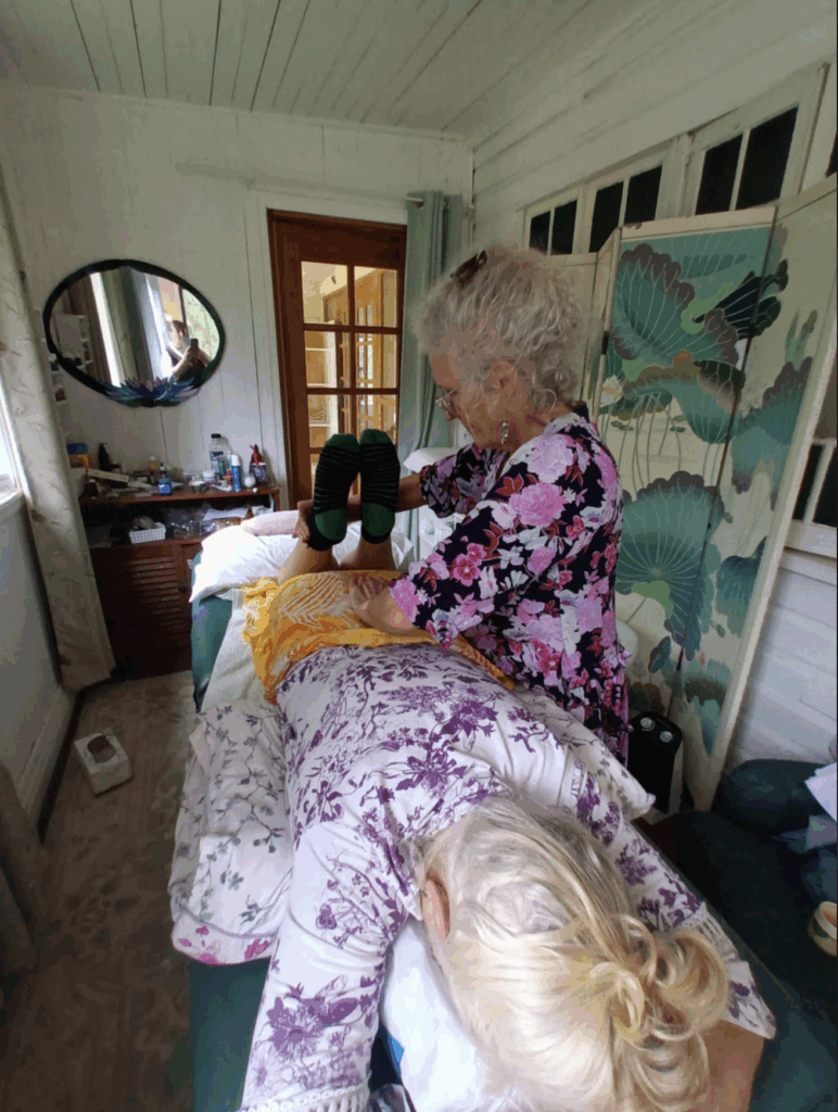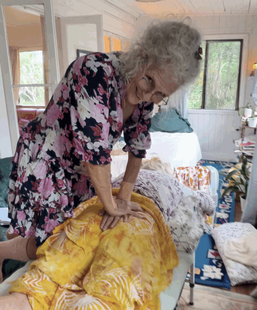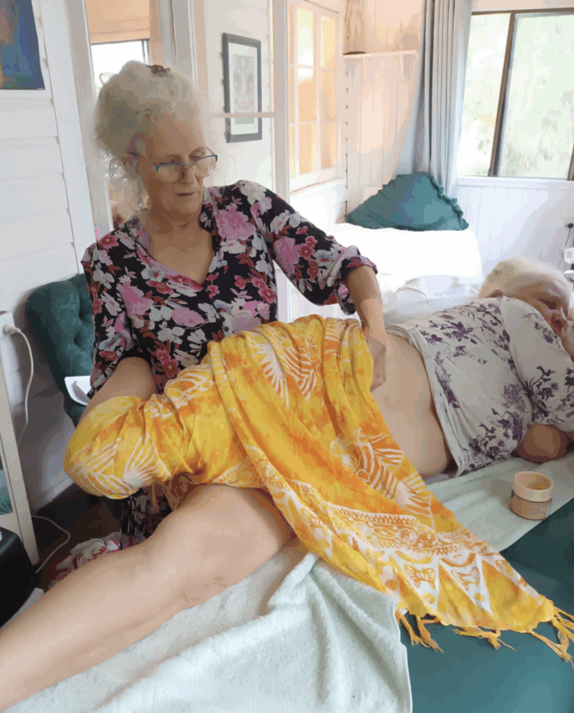 We have to be in a position where we’re comfortable to do the sacral smash and we keep on checking on them and we can go harder and harder and harder. There’s three minutes worth. We come up gradually, then go under the bum crease. I tend to park myself on the edge of the couch so I’m in a straight line going up and I do the other side because it’s too much hassle to go around. I must take off my fingernails before we do this. We do what borrowed from the Arvigo. Our hand on their sacrum and pressing towards the feet. Not going down into the body. Then you’ve got the knees and you bring them up. A gentle stretch.
